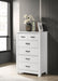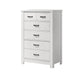 - The elegant and functional Cassini White 5-Drawer Chest offers generous storage space with its five spacious drawers, allowing you to neatly organize and store your belongings. Featuring sleek black handles, the drawers of this chest are not only easy to access but also add a touch of sophistication to its overall design. A unique visual element with its top drawers is the split design while maintaining their full size. The top surface makes an ideal spot for displaying decorative items, such as a small plant or a cherished photo frame. Each drawer provides ample space to store clothing, accessories, or other essentials. Elevate the organization and aesthetics of your home with this versatile and stunning piece of furniture.