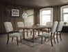 - Elegant Table Design: This dining room set features a rectangular table with a robust wooden trestle base and elegantly turned posts, offering a blend of traditional charm and durability.