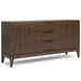 - Features three (3 )central drawers with metal glides, and two (2) sidedoors that open to large storage spaces with one (1) adjustable shelf each.