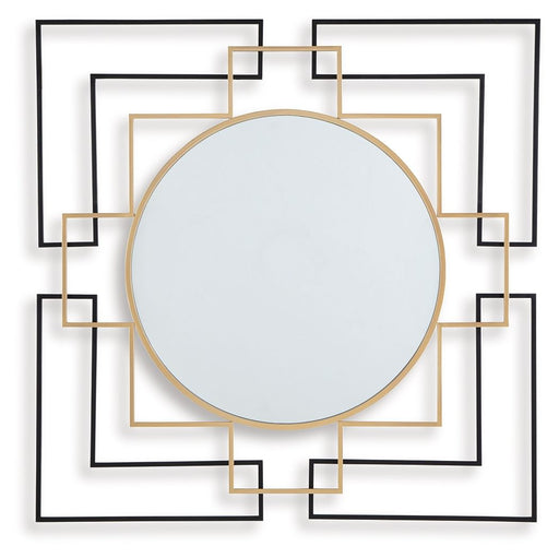 Signature Design by Ashley®This accent mirror makes a bold statement in contemporary and industrial spaces. Framed with sunburst-style metal fretwork and finished in a luxe b...
