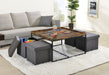 • Looking to style your living room all the while keeping it tidy? The Vinny collection is just the set for you! The Vinny collection manages to be stylish and compact. Featuring a stunning wooden tabletop with raised edges and black metal frame, this coffee table is sure to become the envy of your peers. The raised edges are perfect for keeping items on the table and making your possessions slide or rolling off a thing of the past. Keeping your living space clear of clutter has never been easier with the included storage stools. Invite your friends and family for a cup of coffee and enjoy chatting or use this table as the perfect board game table. The possibilities are endless when you go with the Vinny Collection.