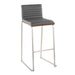 - **Dimensions & Finish**: The barstool measures 19 inches in length, 17.5 inches in width, and 38.75 inches in height, with a sophisticated blend of stainless steel, wood, and faux leather.