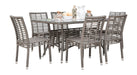 Elevate your Furniture > Outdoor > Outdoor Sets experience with the stylish and modern Panama Jack Graphite 7-Piece Side Chair Dining Set with Cushions. Crafted from durable see-through grey fiber hand woven over aluminum frames, this dining set is resistant to corrosion and scratching, making it ideal for any Furniture > Outdoor > Outdoor Sets space. Customize your dining area by combining this set with other items from the Graphite collection to meet your specific needs. The 36" x 60" rectangular dining table comes with a tempered glass top for easy setup and completion of your perfect Furniture > Outdoor > Outdoor Sets area. The set includes comfortable cushions in an off-white outdoor polyester fabric for added comfort and style. Experience the ultimate Furniture > Outdoor > Outdoor Sets bliss with the Panama Jack Graphite 7-Piece Side Chair Dining Set.. luxury outdoor durable. luxury outdoor durable. luxury outdoor durable
