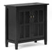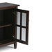 - Features storage compartment with two adjustable shelves behind wood framed tempered glass door