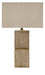 - Made of faux travertine and metal with rectangle hardback fabric shade