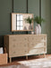 Clean-lined and contemporary - but far from stark - this bedroom package is a fresh style awakening. A mix of materials with dry, light finish with replicated oak grain and authentic touch and a replicated cane finish. Cases feature a framed front and pilasters, framed drawers with cane fronts and bronze color knob. Side roller glides for smooth operating drawers. Drawer interiors finished with a replicated linen design. Both USB and wireless charging options are provided with the nightstands. Mirror has the versatility to be mounted on dresser or wall horizontally or vertically.