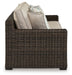 Who says the great outdoors isn’t made for luxury living? This sofa with cushion offers all the high-end design, plush comfort and durability you could ask for, and then some. Its all-weather, rust-proof aluminum frame provides the easy-breezy wicker look you love without the high maintenance. Rest assured, the high-performing Nuvella® fabric covering the cushions and throw pillows is made to stand up to the elements.