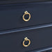 - Brushed Gold Ring Pulls: Adds a refined accent to the dark blue finish