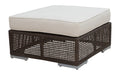 Elevate your outdoor space with the Soho Ottoman with Cushion, a part of the Soho Collection that blends modern design with comfort. This unique see-through modular sectional offers endless possibilities for a sofa, loveseat, armless chair, or standard sectional setup. The Ottoman boasts a fully anodized aluminum frame woven with Rehau Java Brown fiber, creating a distinctive look with a multi-colored textured surface perfect for outdoor use. With the Soho Collection, you can create a customized sectional that will impress your neighbors and enhance your outdoor decor.. luxury outdoor durable. luxury outdoor durable