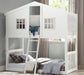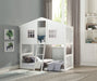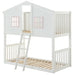 - Charming Cottage Design: This twin-over-twin bunk bed features a delightful cottage style, complete with a doorway, two windows, and an open roof design, adding a playful touch to any child's bedroom.