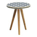 • Features: solid mango wood, oak-ish finish, bone inlay top, tripod stool