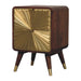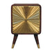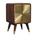 • Avora Brass Embossed 2 Drawer Chestnut Nightstand - An exquisite blend of elegance and artistry, this nightstand is handcrafted from 100% Solid Mango Wood in a rich chestnut finish, beautifully complemented by a striking brass embossing on the front. The intricate sunburst pattern on the cabinet doors, with metallic handles, adds a touch of glamour, while the Nordic-style legs with brass caps enhance its refined aesthetic. Designed with both style and functionality in mind, this piece offers discreet storage for your essentials while serving as a stunning focal point in any bedroom or living space. A true statement of craftsmanship, it seamlessly combines luxury with sustainable design.