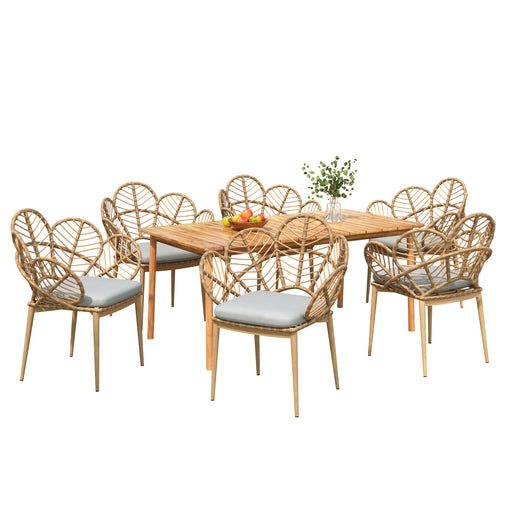 Noble HousePremium Acacia Wood Table: Sustainably sourced wood with rich grain and weather resistance. Floral-Inspired Iron-Frame Chairs: Petal-inspired back...