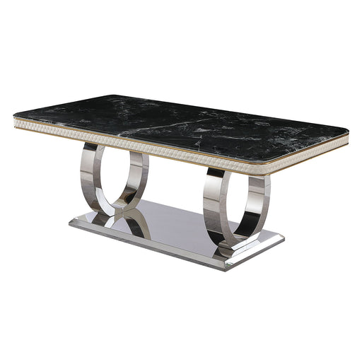 CoasterEssenceStrikingly modern with a classic twist, this dining table features a spacious faux marble top and an asymmetrical gunmetal metal base. The clean wh...