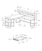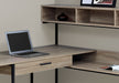 - Worksurface Layout: The desktop is divided into two segments, with a large panel overlapping the storage unit with a hutch, creating a smaller, lower workspace and additional storage cubby for flexibility.