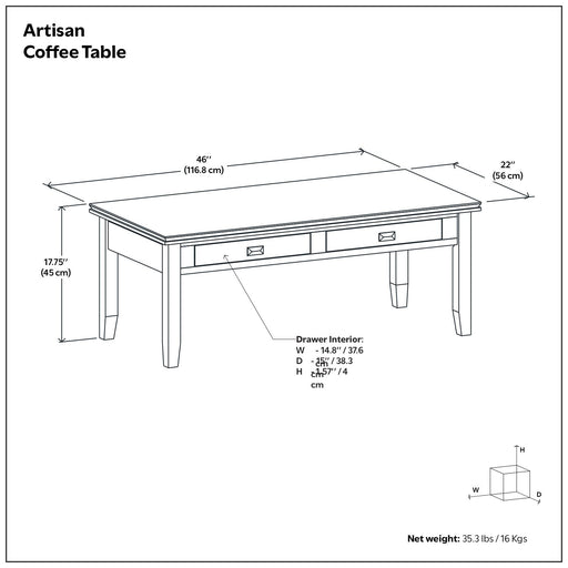 Simpli-HomeDimensions: 22"D x 46"W x 17.75"H for ideal placement with standard sofas Solid Wood Quality: Handcrafted with durable solid wood for lasting stre...