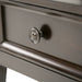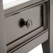 • Transitional design includes tapered legs, molded crown edged table top, panel framed drawer fronts and antique bronze round decorative knobs