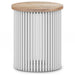- Features solid wood table top and tall cylinder shape with unique pipe design base