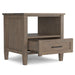 - Features one bottom drawer with metal drawer glides and an open shelf for storage
