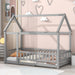 Full Size Floor Wooden Bed With House Roof Frame, Fence Guardrails - Gray