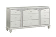 - Elegant Design: The Maverick Platinum Finish Dresser combines elegance and functionality, featuring nine spacious drawers ideal for ample storage. Its sophisticated arched top drawer adds a refined touch to its overall design.