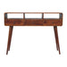 - Triple Curved Chestnut Console Table - This simple, elegant console table has beautifully curved edges to fit perfectly in any living space, this 100% solid mango wood unit has been built with sustainably sourced timbers and has 3 drawers as well as 3 open slots for plenty of storage space to help you keep your home organized. It has a shiny brass knob on each drawer and has a fine chestnut finish with 4 Nordic style legs.