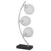 Graceful silhouetting pairs with a trio of elegant wire frame orb shades in a modern table lamp. Designed to make an impact on a console or side table, it features a fresh, modern look complete with a vertical arc frame in a chrome finish. The arc hosts three orb shades made from metal mesh, creating a striking effect of light and shadow. The light features three lights, each with an energy efficient 4-watt bulb that delivers bright illumination at a fraction of the cost. Finally, the lamp rests on a black finish rectangular base and offers a touch switch for truly seamless operation.