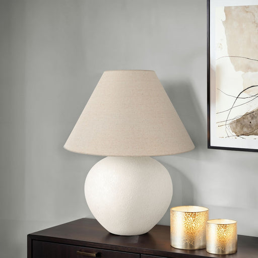 8th StreetChic Design: This table lamp features a globe-shaped, textured cream ceramic base with an ivory fabric drum shade, offering a contemporary lo...